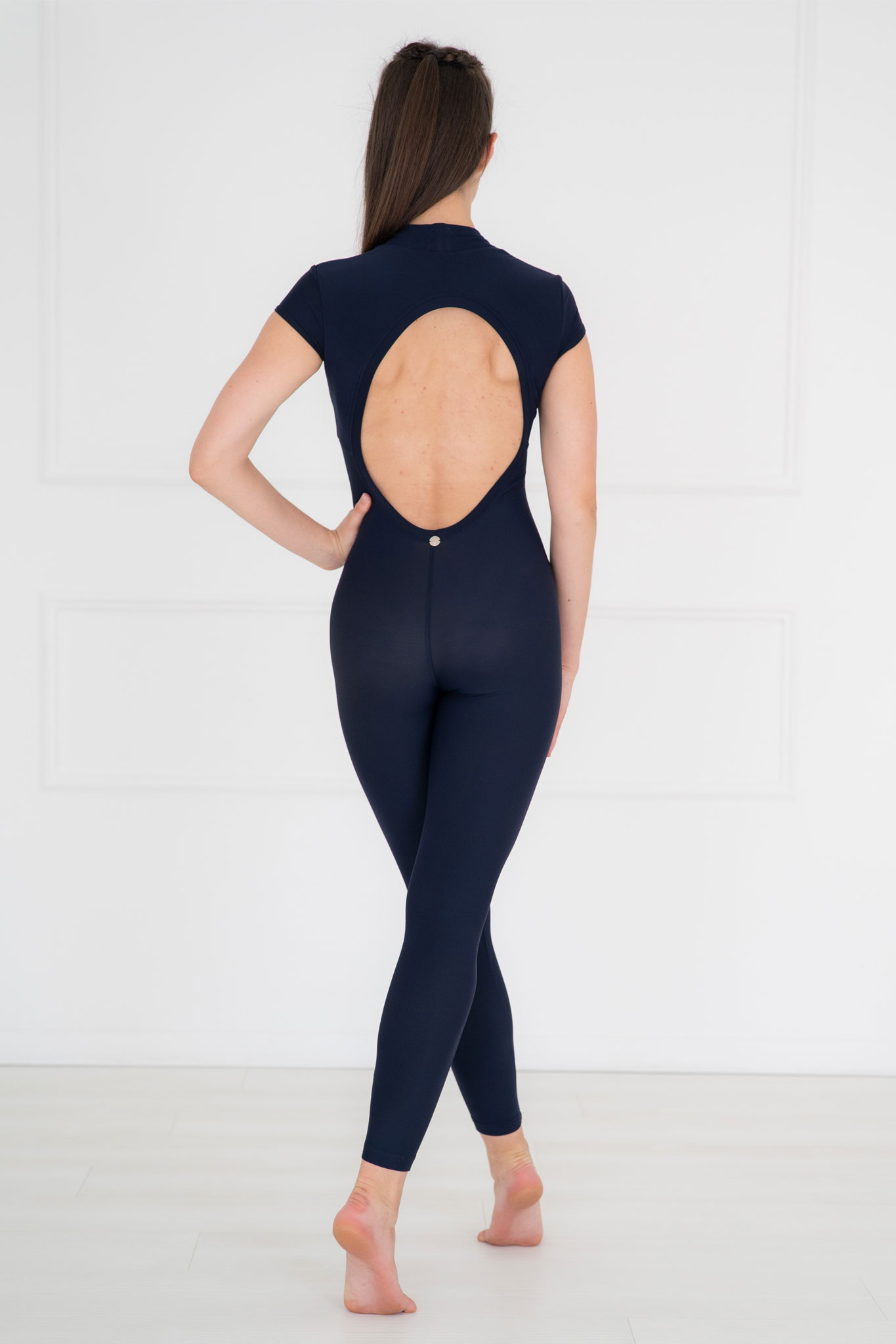 Mirada Sötétkék Busra overall, mély hátkivágással, belül felcsiszolt, puha elasztikus poliamid anyagból, mely kényelmes viselet tánchoz és jógához egyaránt. Ezt az igazán elegáns megjelenésű kezeslábast átlapolt V-kivágással és rövid ujjakkal díszítettük, a nadrágrész pedig követi az alakod. Kivehető mellpárnája biztonságot nyújt a mozgás során, ugyanakkor mosásnál könnyen eltávolíthatod, így megőrizve annak formáját. Az overall anyaga tökéletesen illeszkedik a testedre, garantáltan imádni fogod!
